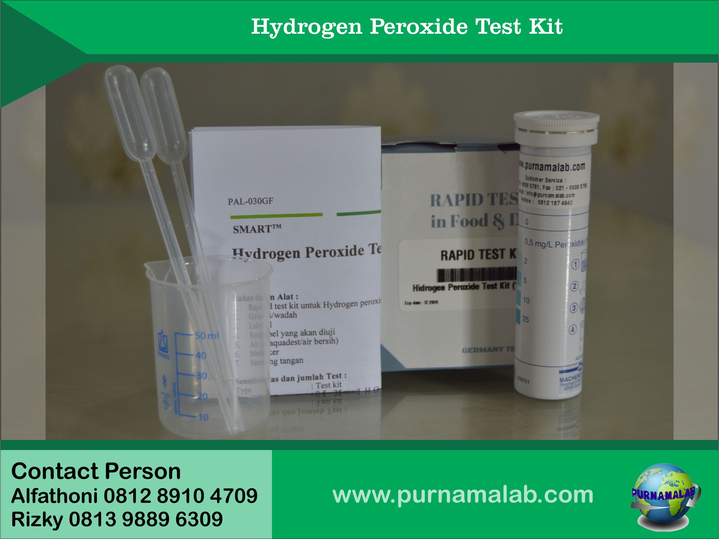 Hidrogen Peroksida Test Kit Hidrogen peroksida test kit merupakan alat uji kandungan peroksida yang berupa test strip semi kuantitatif. Hidrogen Peroksida Test Kit merupakan alat uji CEPAT, TEPAT, AKURAT dan lebih sensitif dibandingkan peroksida test lainnya dari yang sudah beredar. Penggunaannya mudah dan dalam 15 detik mampu memberikan hasil analisis yang dapat diandalkan. Test kit ini mampu mendeteksi kandungan hidrogen peroksida dengan limit deteksi 0,5 mg/L (ppm). Target Sampel :